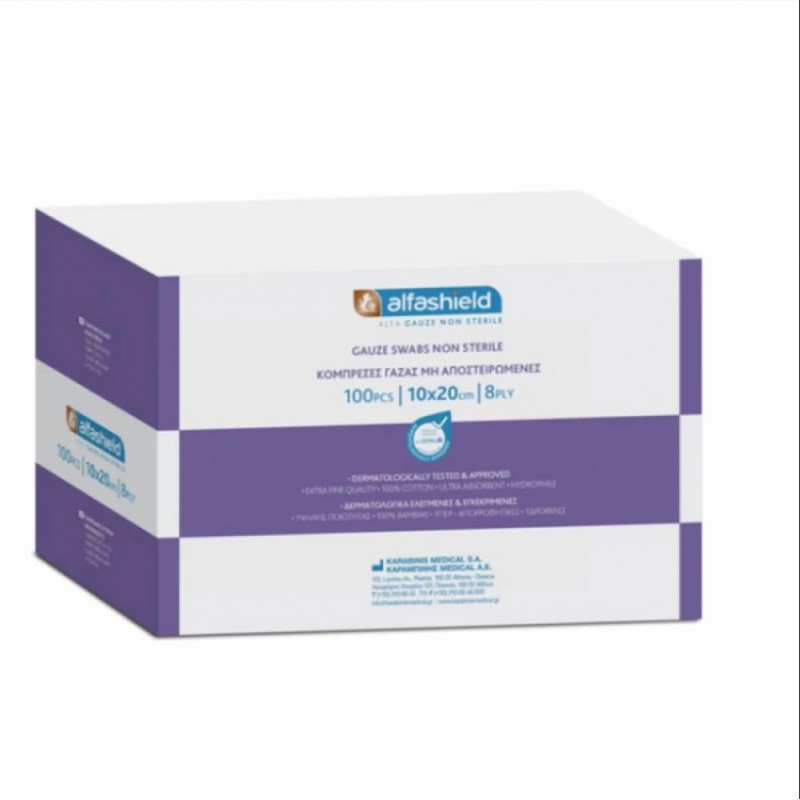 Οι μη αποστειρωμένες γάζες ALFA GAUZE/ Alfashield κατασκευάζονται από 100% άριστης ποιότητας βαμβάκι για μέγιστη ασφάλεια και προστασία. Είναι υδρόφιλες, μεγάλης απορροφητικότητας, άοσμες, χωρίς κατάλοιπα λευκάνσεως και με διπλωμένα άκρα.
