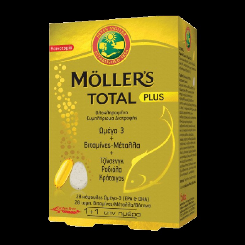 Ολοκληρωμένη φόρμουλα για ενήλικες, περιλαμβάνουσα τα σημαντικότερα διατροφικά στοιχεία. Κάθε μία από τις 4 καρτέλες της συσκευασίας Moller's Total Plus περιέχει μία σειρά κάψουλες με ωμεγα-3 (EPA 174 mg, DHA 123 mg), και μία σειρά ταμπλέτες με βιταμίνες, μέταλλα, ιχνοστοιχεία και βότανα.