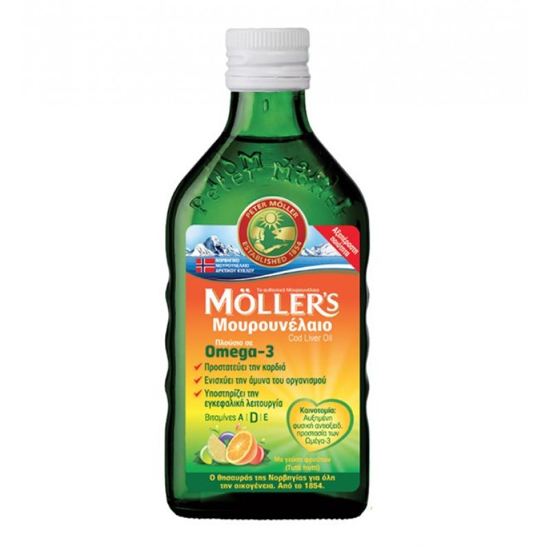 Το μουρουνέλαιο Möller’s αποτελεί εξευγενισμένο έλαιο από φρέσκο συκώτι μουρούνας ή άλλων ψαριών της οικογένειας Gadidae, όπως ο βακαλάος και ο γάδος. Είναι πλούσιο σε ω-3 λιπαρά οξέα και βιταμίνη D, ενώ περιέχει και βιταμίνη Α και βιταμίνη Ε (σαν αντιοξειδωτικό). Έτσι τα ωφέλη για τον οργανισμό είναι πολλαπλά: